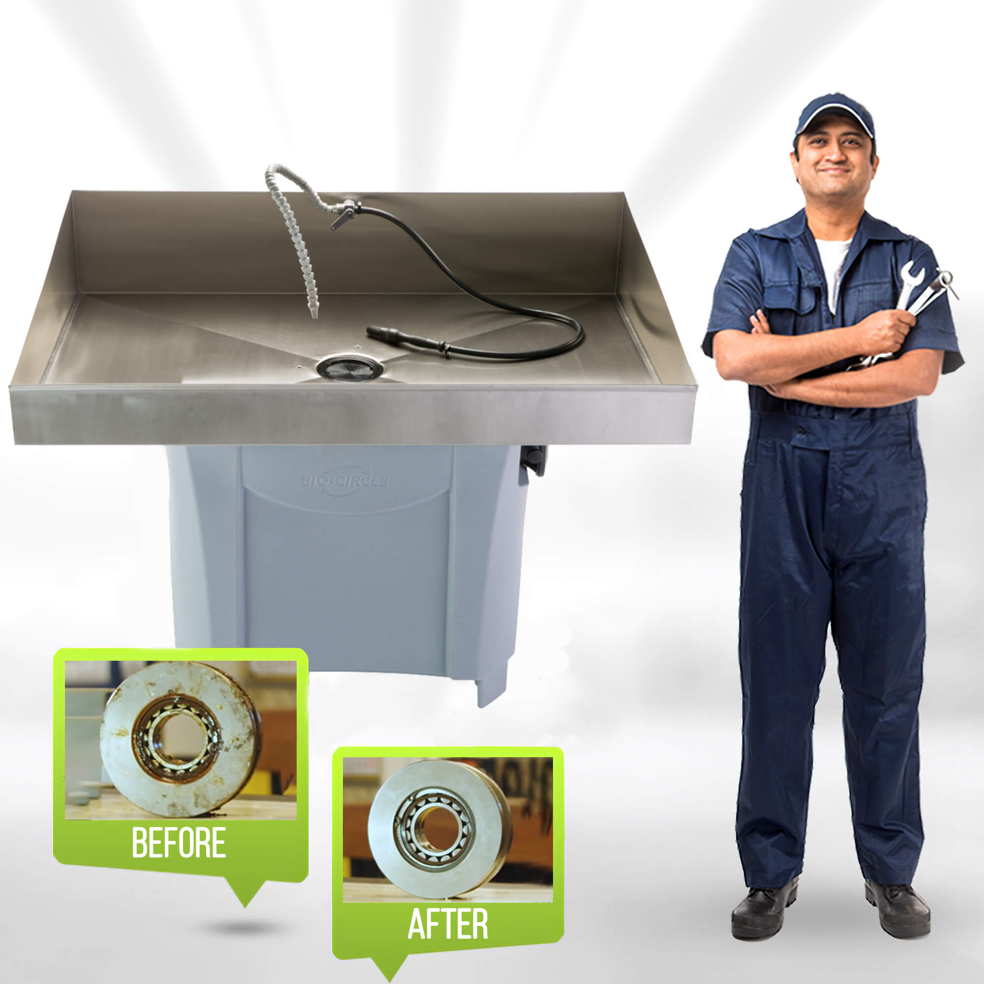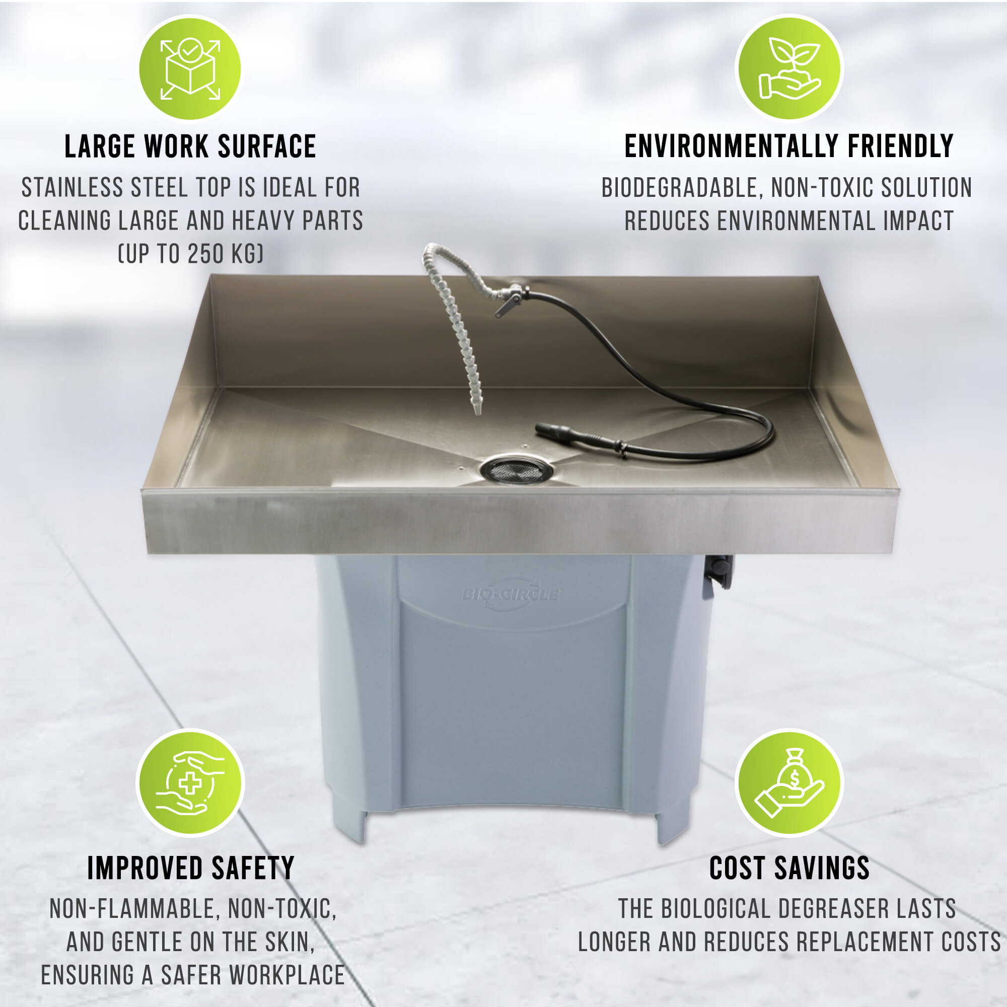 Die großzügigen Abmessungen des Bio Circle GT-i Maxi 17-i machen dieses Teilereinigungsgerät ideal für Werkstätten mit hohem Reinigungsbedarf, insbesondere wenn große und schwere Teile gründlich gereinigt werden müssen. Der robuste Teilewaschtisch entfernt selbst hartnäckige Verschmutzungen wie Fette, Öle und Korrosionsschutzfilme effizient und bleibt dabei vollkommen umweltfreundlich. Dank seiner Kombination aus Langlebigkeit und Reinigungsleistung ist der GT-i Maxi 17-i die perfekte Wahl für Unternehmen, die groß angelegte Reinigungsvorgänge durchführen möchten und gleichzeitig ihre Umweltbelastung minimieren wollen. Das effiziente Filtersystem trennt grobe und feine Verunreinigungen, während natürliche Mikroorganismen Fette und Öle biologisch abbauen – eine Innovation, die die Reinigungskraft weiter steigert. Weitere Informationen
