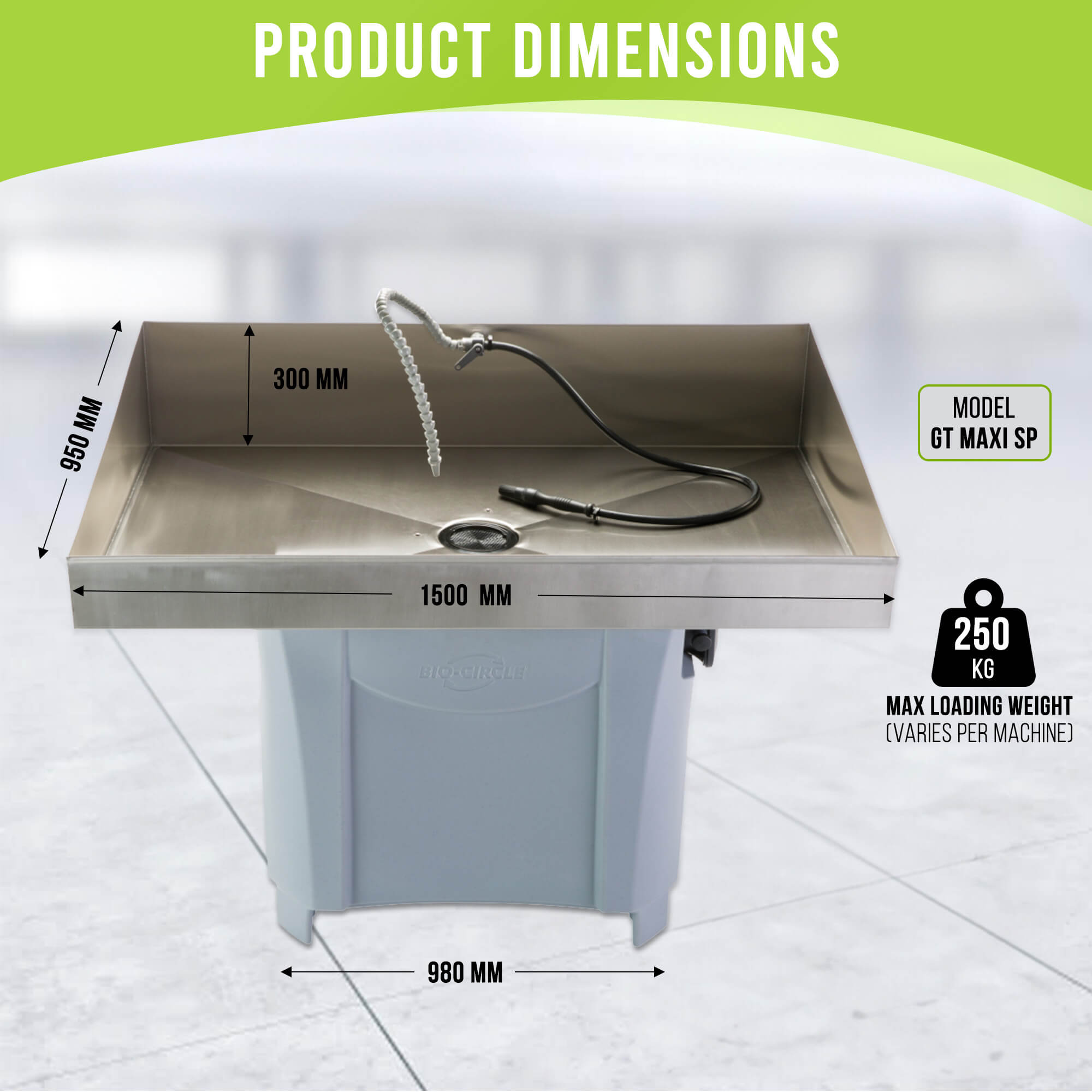 Das Hochdruck-Teilewaschgerät Bio Circle GT-i Maxi 17-i ist speziell für die Teilereinigung großer und schwerer Komponenten ausgelegt. Das verstärkte, rostfreie Edelstahl-Oberteil bietet eine außergewöhnliche Tragkraft von bis zu 250 kg, während die extra große Arbeitsfläche von 1500 x 950 mm genügend Platz für umfangreiche Reinigungsaufgaben bietet. Dank der großzügigen Maße können sogar zwei Personen gleichzeitig am Teilewaschgerät für Werkstätten arbeiten.