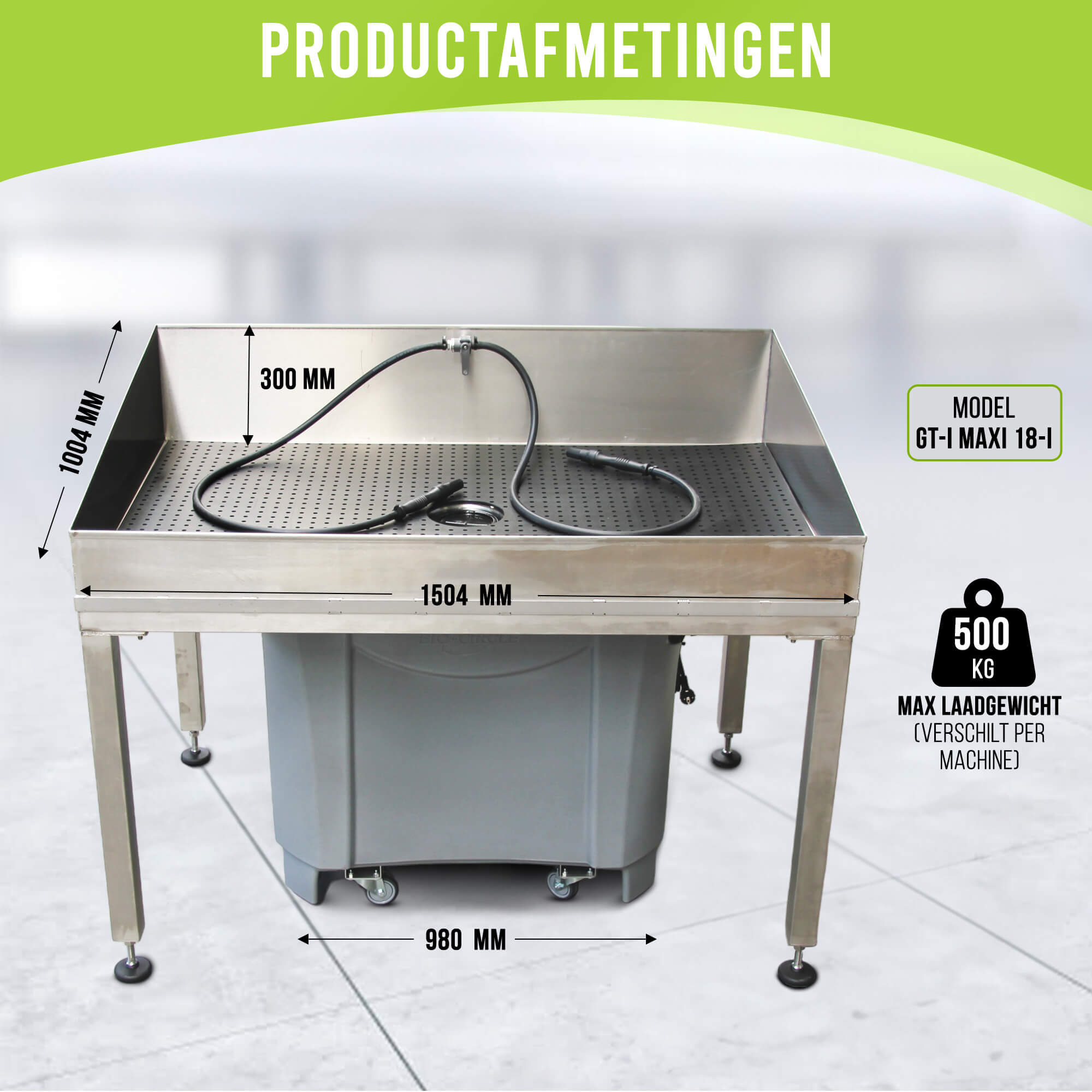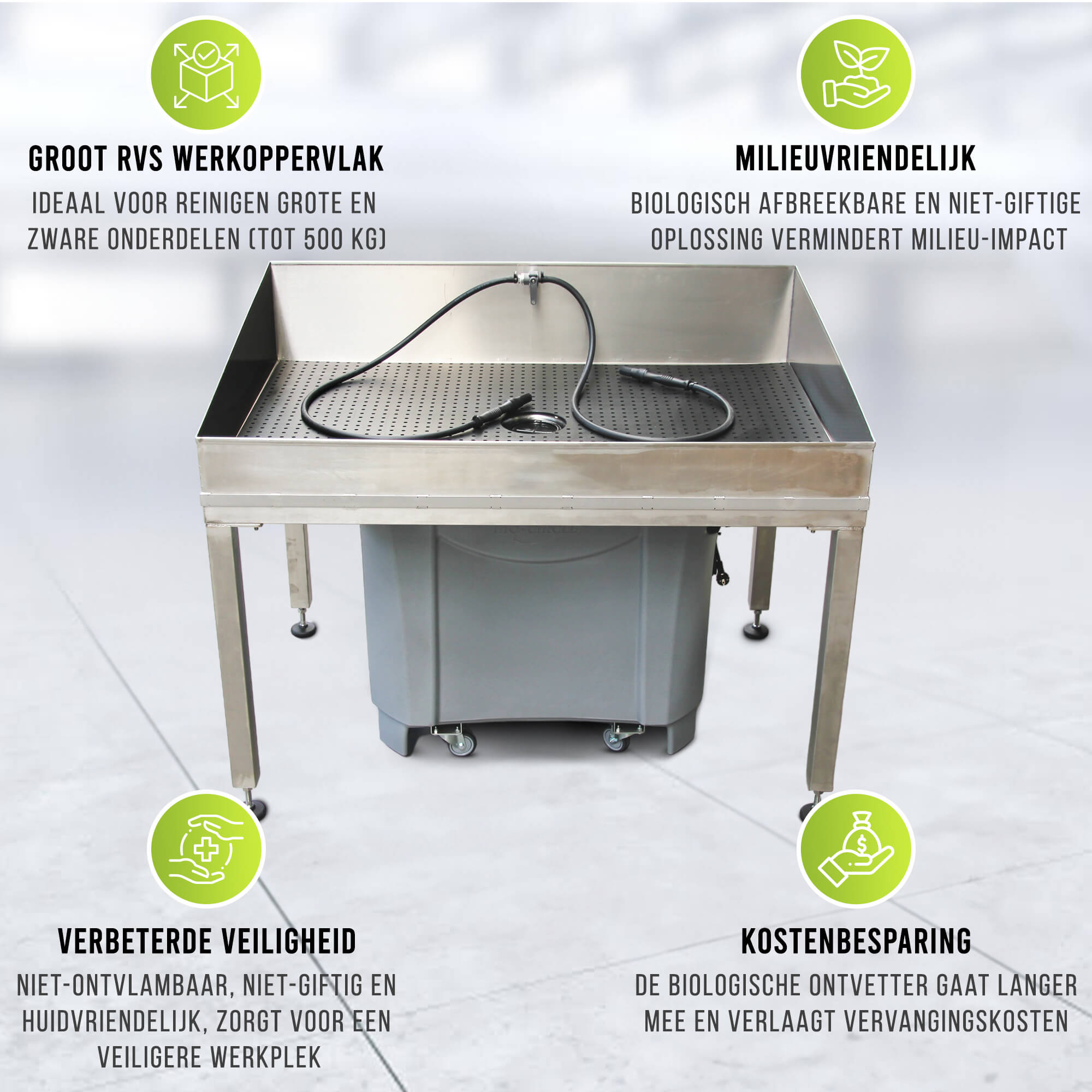 - Groot Werkoppervlak: Ruim werkoppervlak van ongeveer 1500 x 950 mm voor het reinigen van grote onderdelen.
