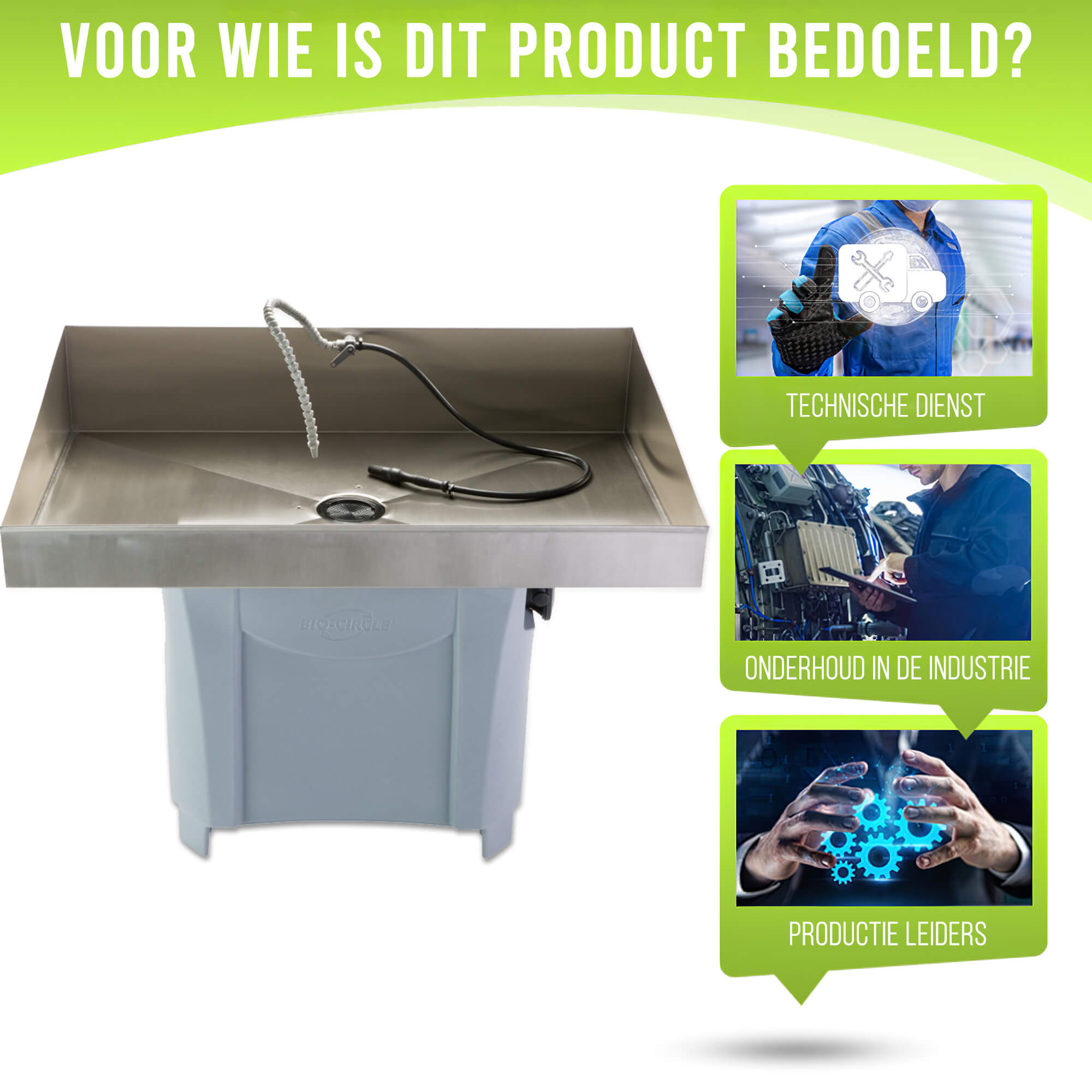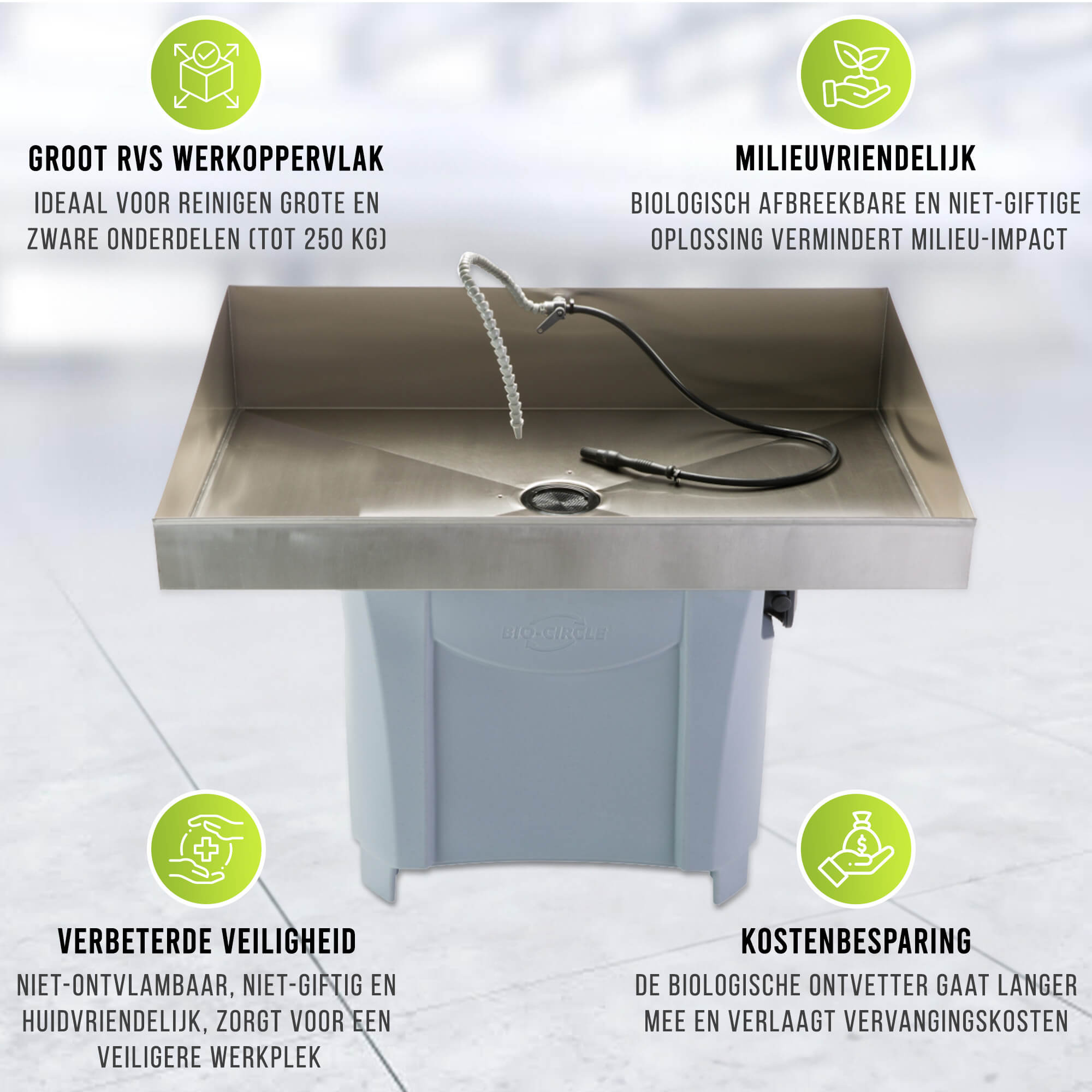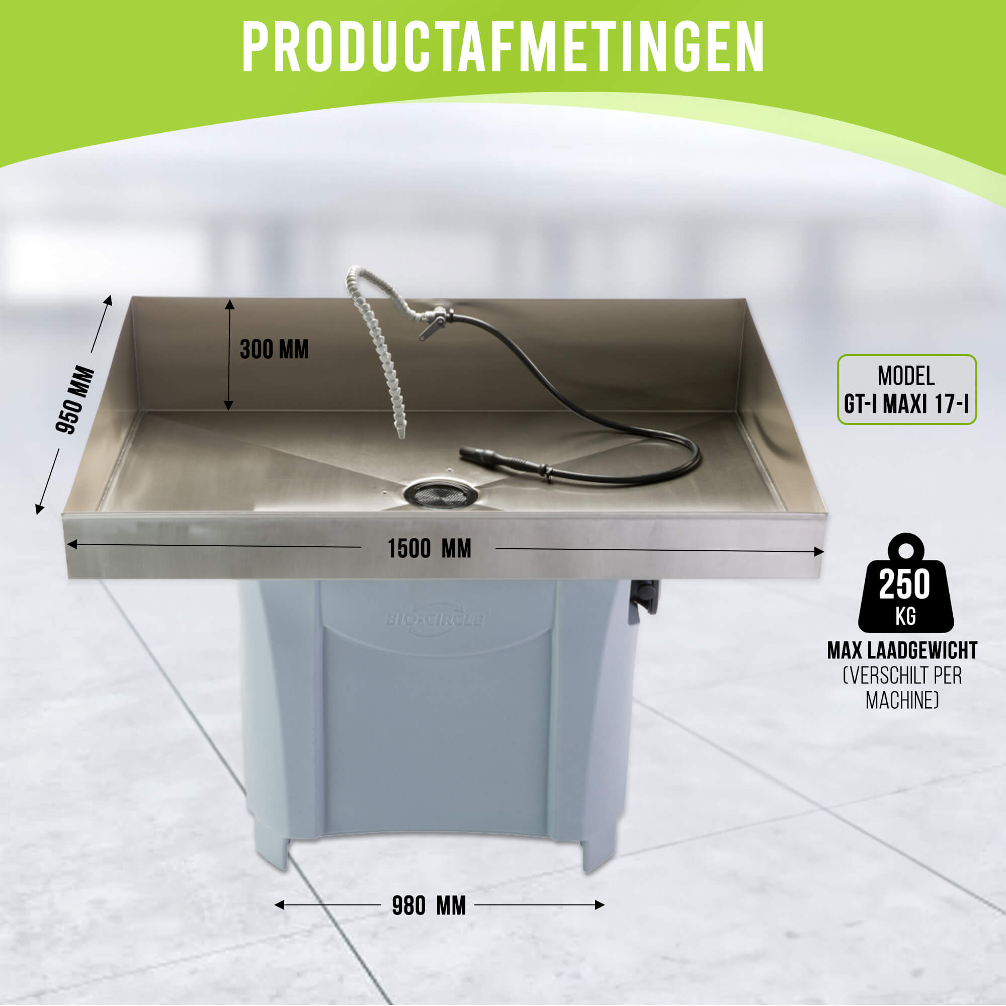 Het roestvrijstalen topstuk voor de Bio Circle GT-i Maxi 17-i biedt bijzonder een bijzonder hoog draagvermogen (tot 250 kg). Het extra grote werkoppervlak ( 1500 x 950 mm) is handig wanneer grote en zware onderdelen gereinigd moeten worden. Dit stelt zelfs twee gebruikers in staat om tegelijkertijd aan de onderdelenreiniger te werken. De roestvrijstalen topstukken zijn uitgerust met een conische afvoer, zeef- en zakfilters (25 μm), en optioneel met roosters van PE om de oppervlakken te beschermen. De bijgeleverde borstel, aangesloten op de spoelarm, maakt het mogelijk gericht hardnekkig vuil te verwijderen. Deze combinatie zorgt voor een snelle en efficiënte reiniging zonder schadelijke oplosmiddelen.
