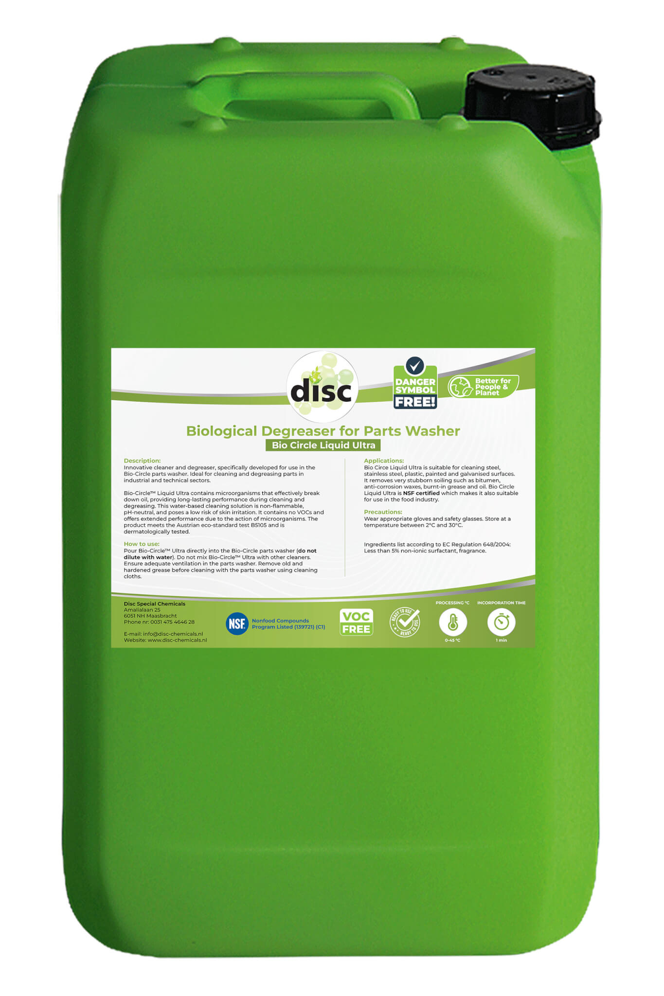 Bio Circle Liquid Ultra ist ein nicht brennbarer Werkstattreiniger, ideal als Teilewaschgerät Reiniger für ein Teilewaschtisch.Er gibt keine giftigen Dämpfe ab und erfordert daher keine zusätzliche Absaugung. Fette, Öle und Ruß werden durch Mikroorganismen auf natürliche Weise abgebaut. Dieser Teilereiniger eignet sich hervorragend zur Reinigung von Stahl, Edelstahl, Kunststoff, lackierten und verzinkten Oberflächen. Dank der NSF-Zertifizierung ist Bio Circle Liquid Ultra auch für den Einsatz in der Lebensmittelindustrie zugelassen Weitere Informationen