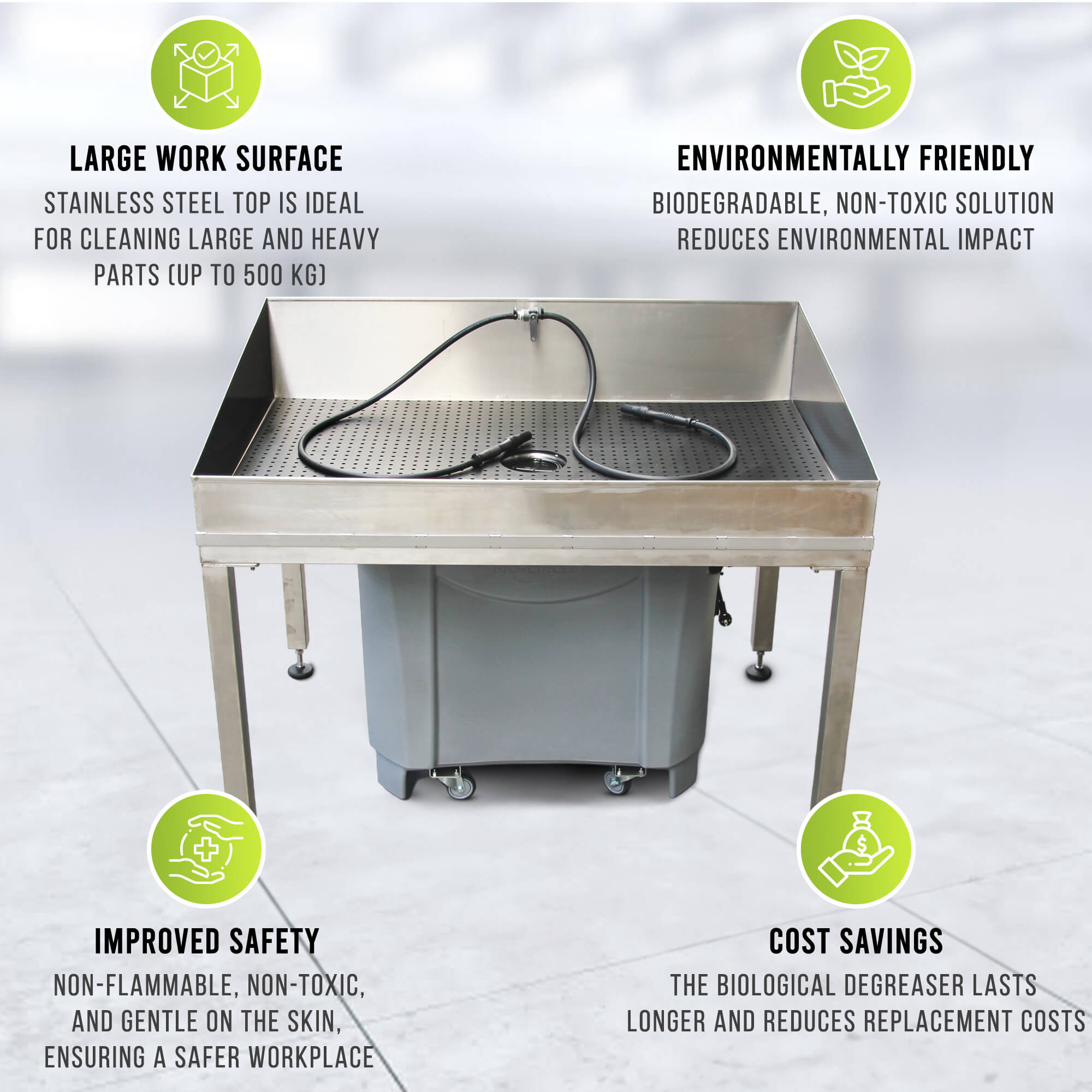 Die großzügigen Abmessungen des Bio Circle GT-i Maxi 18-i machen dieses Teilereinigungsgerät ideal für Werkstätten mit hohem Reinigungsbedarf, insbesondere wenn große und schwere Teile gründlich gereinigt werden müssen. Der robuste Teilewaschtisch entfernt selbst hartnäckige Verschmutzungen wie Fette, Öle und Korrosionsschutzfilme effizient und bleibt dabei vollkommen umweltfreundlich. Dank seiner Kombination aus Langlebigkeit und Reinigungsleistung ist der GT-i Maxi 18-i die perfekte Wahl für Unternehmen, die groß angelegte Reinigungsvorgänge durchführen möchten und gleichzeitig ihre Umweltbelastung minimieren wollen. Das effiziente Filtersystem trennt grobe und feine Verunreinigungen, während natürliche Mikroorganismen Fette und Öle biologisch abbauen – eine Innovation, die die Reinigungskraft weiter steigert. Weitere Informationen