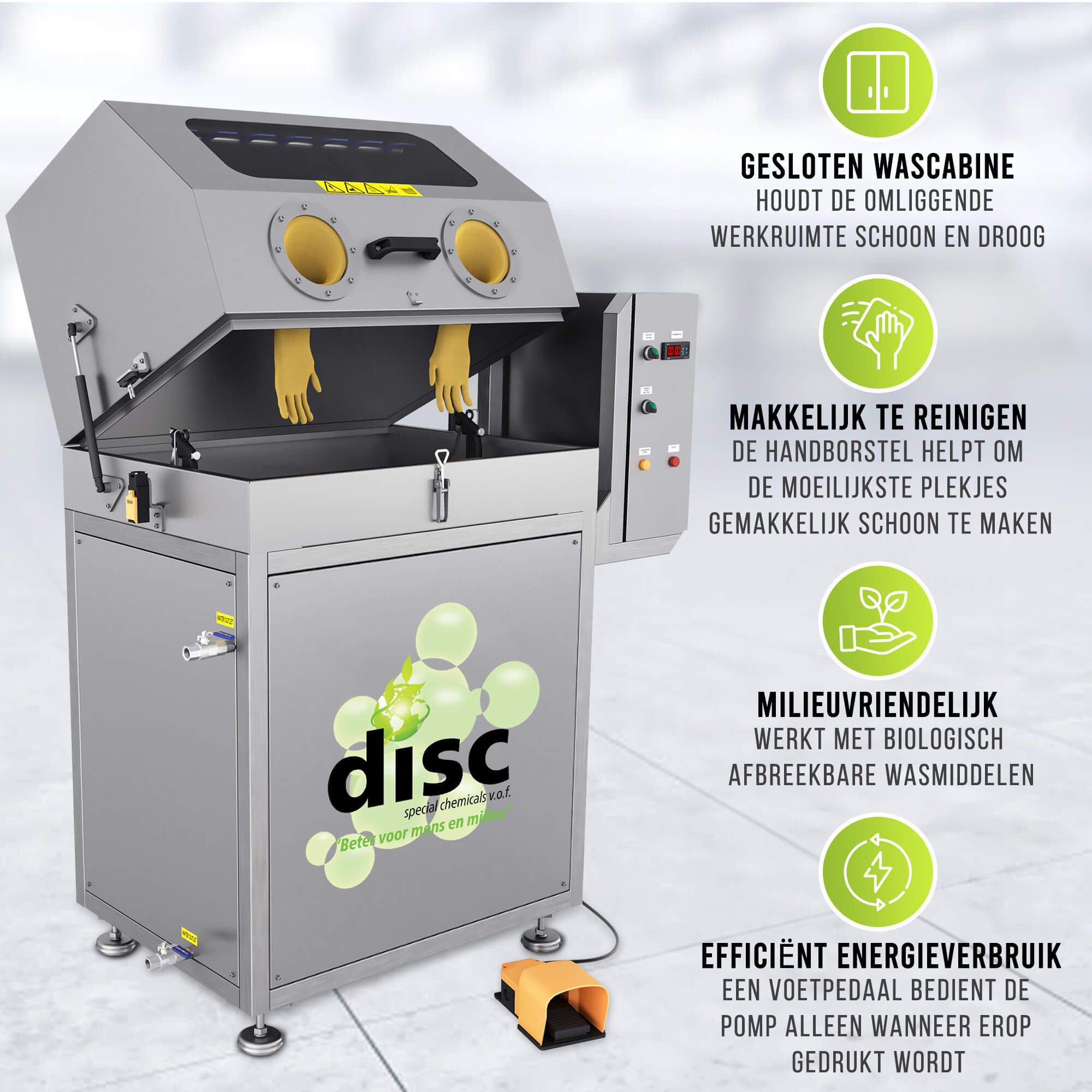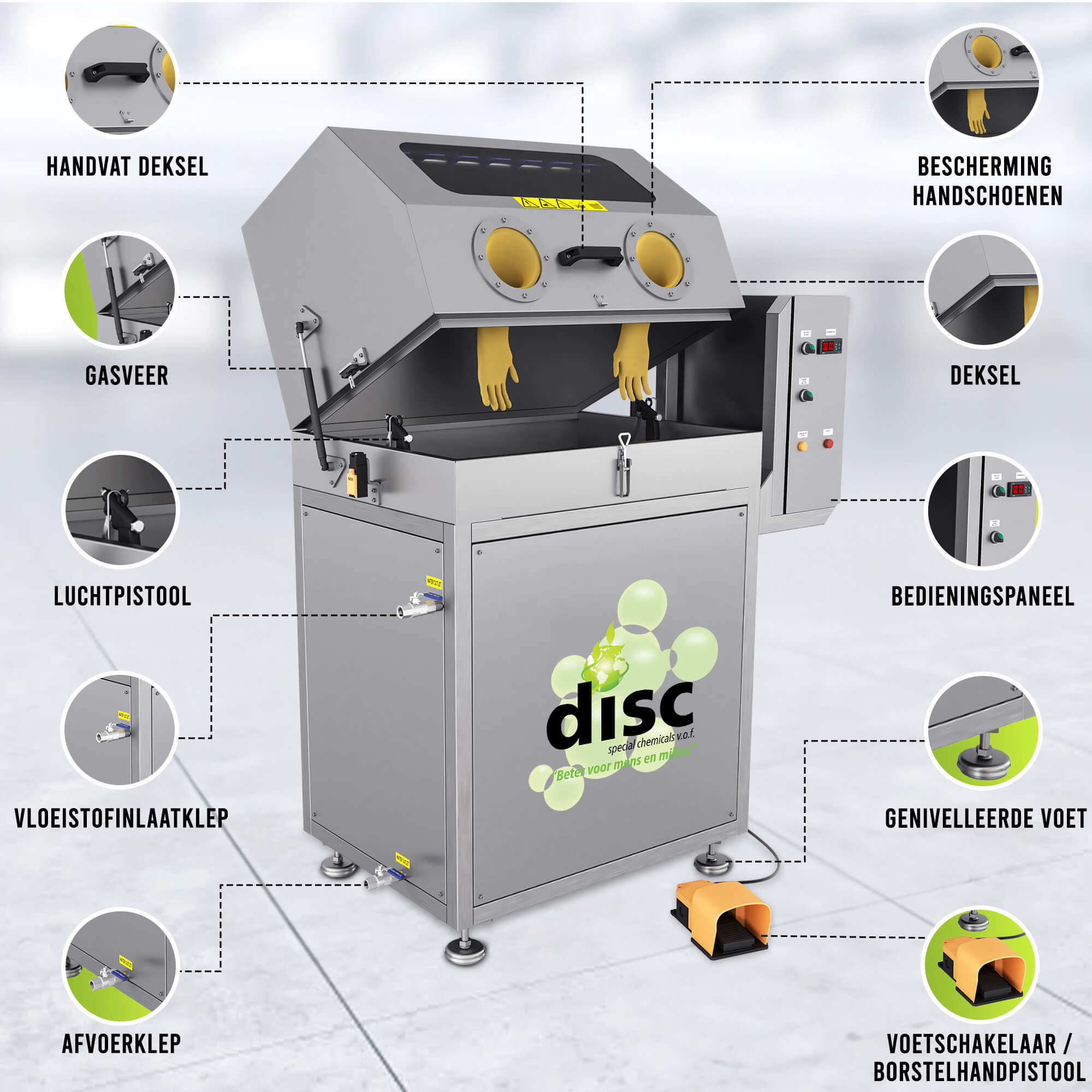 - Gebruiksvriendelijke Handschoenen: De ingebouwde handschoenen maken het mogelijk om de onderdelen veilig en hygiënisch te hanteren tijdens de reiniging.
