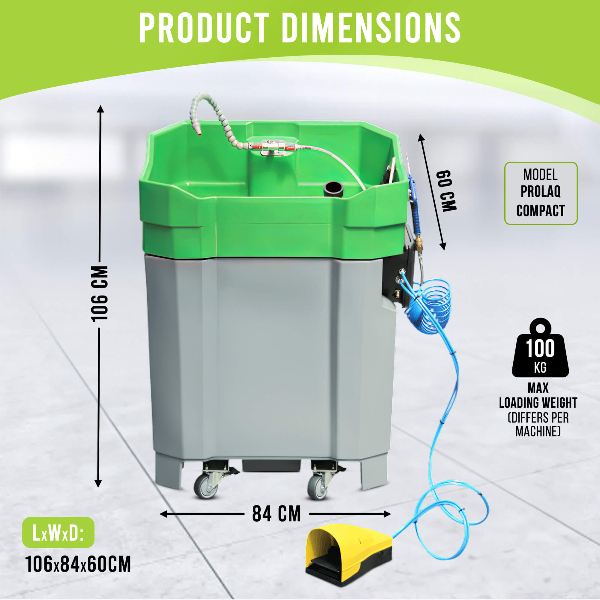 Die Maschine verwendet eine Druckluftmembranpumpe (6 bar), die gereinigte Bauteile effizient trocknet und über ein Fußpedal gesteuert wird. Der kompakte Teilereiniger Waschtisch bietet eine Arbeitsfläche von 730 x 520 mm und eine maximale Belastbarkeit von 100 kg. Der PROLAQ Compact ist kompatibel mit speziellen Reinigungsflüssigkeiten wie Tint entferner Typ D, Prolac L 100 oder Prolac L 500. Diese Flüssigkeiten sind frei von gefährlichen Symbolen und somit sicherer für Mensch und Umwelt.
